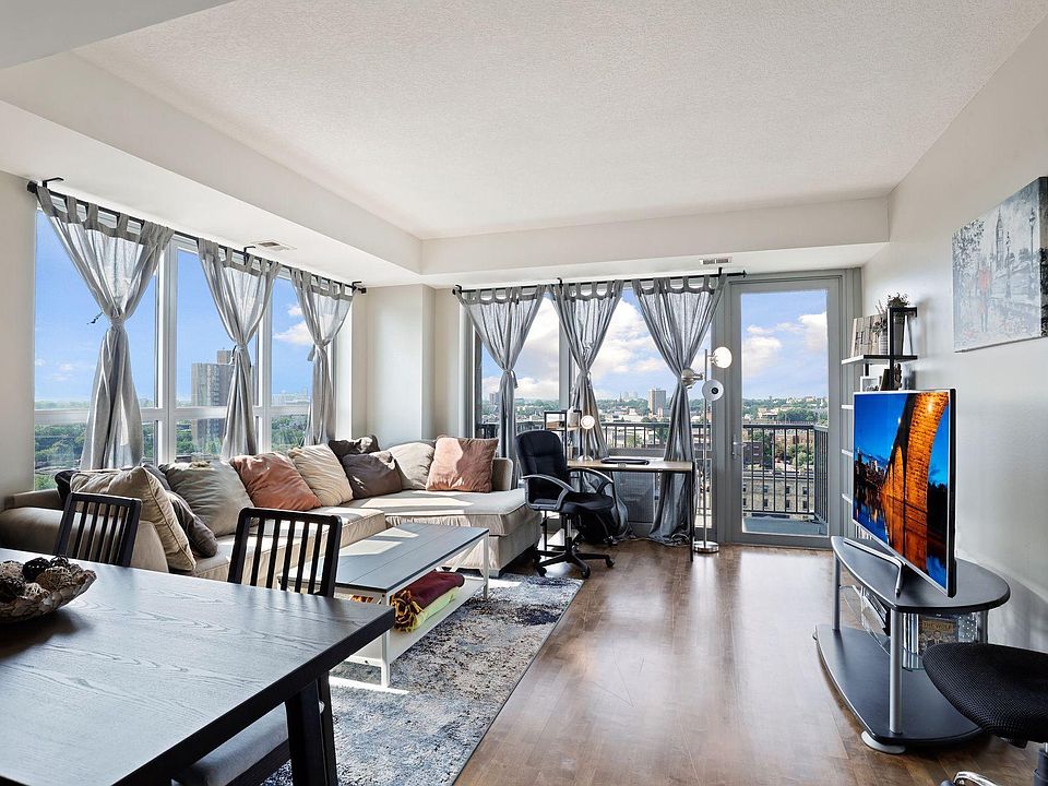 Rare 10th floor 1BR, 1BA corner unit w/1 Pkg at Skyscape Condos with eastern and southern exposure offering tons of natural light. Features include hardwood flooring throughout living space, open versatile floor plan, large balcony overlooking rooftop patio and great southern exposure, large bedroom with walk-in closet. Skyscape residents enjoy 24 hr. concierge/security desk; secure access; indoor heated guest parking; fitness center with jacuzzi and sauna; community room and large 6th floor community patio with lawn and grilling stations.