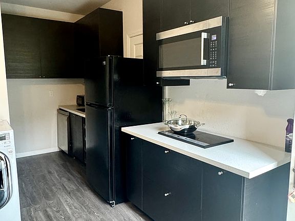 Fully Equipped Kitchen: Features laminate countertops, an electric stove, microwave, sink, refrigerator, dishwasher, and washer/dryer.
