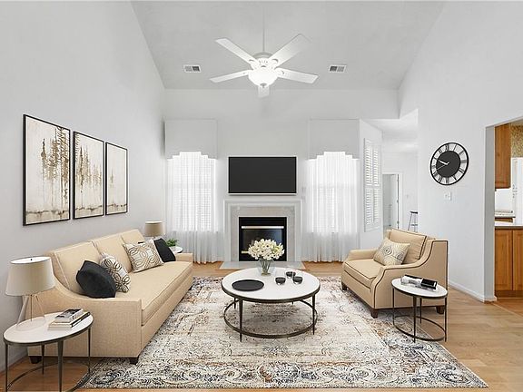 Cozy gas fireplaceFenced patio areaGranite countertopsHardwood floorsCrown moldingAmple cabinetrySpacious primary suite