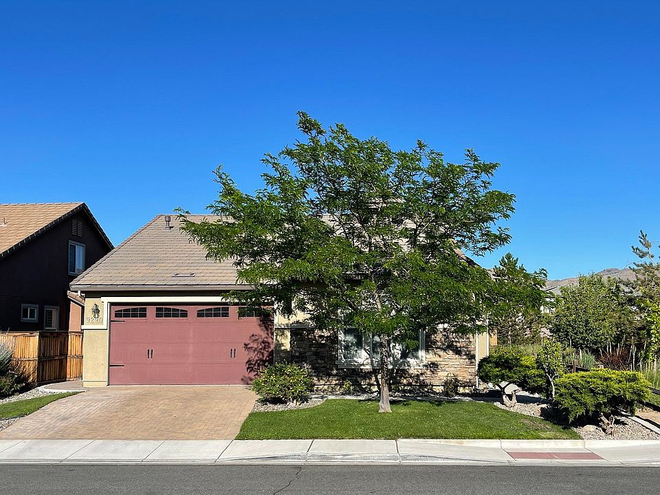 Comfortable single story 3-bedroom 2-bath with attached garage, laminate wood flooring in entrance, dining room and kitchen, carpet in family room and bedrooms, tile floors in both bathrooms and the laundry room, Durastone counter tops, wooden blinds throughout, landscaped front and back, open low maintenance backyard with rose bushes & paver patio with sail shade cover in an ideally located wonderful part of Reno, NV! Master suite features walk-in closet, tub, standup shower & double sinks. Clean & move in ready! Close to schools, parks, shopping and dining. Schedule to see it today! Tenant is responsible for all utilities, except HOA, waste and sewer. Yard and lawn maintenance not included in rent and are tenant responsibilities. Pet on approval with $300 fee plus $500 pet deposit.