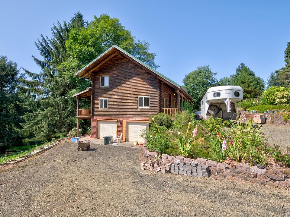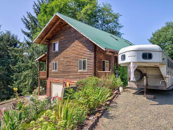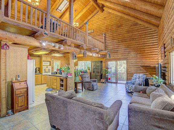 Beautifully built 2-story log cabin home situated on 2.02 acres with fenced pastures, small horse barn and hay shed. Covered front porch, lovely flower gardens and blueberry bushes, as well as wonderful field pastures for the horses.