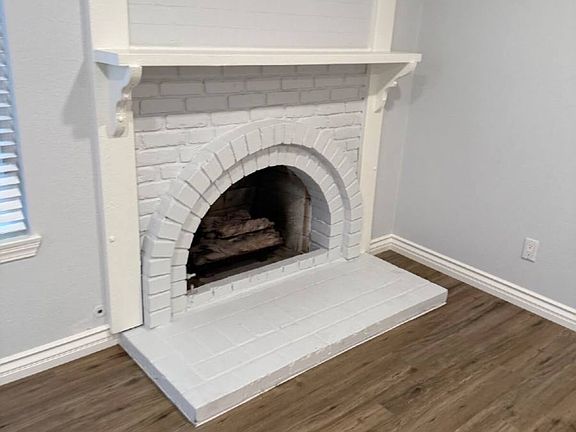 Cozy brick fireplaceFreshly painted neutral paletteSleek white cabinetryFamily roomRenovated kitchenCeiling fanStainless-steel appliances