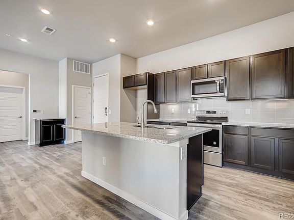 This brand new home is ready for move-in! A fantastic TOP FLOOR end unit near the elevator - You'll find a well-equipped kitchen—boasting a gracious center island that overlooks an expansive great room with direct access to a generous covered balcony. A lavish owner’s suite showcases a roomy walk-in closet and a deluxe private bath with dual sinks and a benched shower. Morning light fills this home highlighting the rich espresso colored birch cabinetry and beautiful granite countertop in the kitchen. Private, corner unit! Home has in-unit laundry room with space for side-by-side appliances. Enjoy the community park, BBQ and fire pit area, and quick access to Westcreek Dog Park, Cherry Creek Trail, DTC, Main Street Parker, Castle Rock and Denver. Open community parking, limited number of one-bay detached garages available for additional purchase price. Building has an elevator. Fantastic Parker location! Photos are not of this exact property. They are for representational purposes only. Please contact builder for specifics on this property. Don’t miss out on the new reduced pricing good through 6/30/2023. Prices and incentives are contingent upon buyer closing a loan with builders affiliated lender and are subject to change at any time.