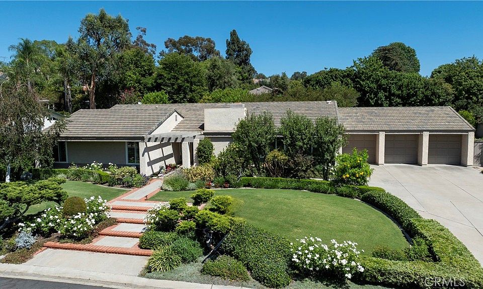 Tucked away in the tranquil hills of Villa Park, this charming TRUE Single-Story estate boasts a top tier location, highly functional floorplan, and sprawling private lot. Unique for the period built, this home has NO steps up or down, giving it a very utilitarian layout. Framed with lush landscape, sprawling grass, and a well-maintained exterior elevation, this home’s curb appeal sets the tone for even the most discerning buyer. Enter through elegant lead glass inlaid front doors to a bright & open entry. Complete with hardwood floors, and a view of the brick finished fireplace, the entry creates a warm & inviting feeling. Soaring cathedral ceilings in both the family and living room make this home feel light, bright, and spacious. The unique high ceilings give the home a newer floorplan feel while maintaining the warmth and charm of a period past. The living room/dining room combo is HUGE with tons of potential. The living room is finished with oversized windows overlooking the manicured front yard, a brick finished fireplace, custom crown, and wood box and art niche. The dining room has plenty of room for an 8-to-10-person dining table, chandelier, and pass-through access to the kitchen. Family room boasts cathedral ceilings, a formidable brick finished masonry fireplace, exposed T and G ceilings, hardwood floors, and beautiful views of the sparkling pool. The kitchen has been recently renovated with elegant white shaker custom cabinets, quartz counter tops, stainless steel appliances, bay window w/ backyard & pool views, tile floor, & glass inlaid uppers. A recessed ceiling detail with upgraded cans floods the kitchen w/ light. Theres plenty of space between the kitchen and family room for kitchen nook w/ slider to the back yard. The laundry and powder bath are perfectly located for guests and pool goer’s access. The primary bedroom is elegantly appointed w/ wood floors, crown molding, newer dual pane vinyl windows, and a slider w/ direct access to the backyard. The primary bath is finished w/ custom cabinets, granite counters, dual vanity sinks, walk in shower, and walk in closet. The yard is an absolute gem w/ beautifully maintained sparkling pool & elevated spa, mature landscape and TONS of space for an ADU or substantial add-on. Both side yards have RV access possibilities or pass through capability. Other features include 3 CAR GARAGE, spacious secondary bedrooms, UPGRADED retrofit dual pane windows, garage storage, & so much more!