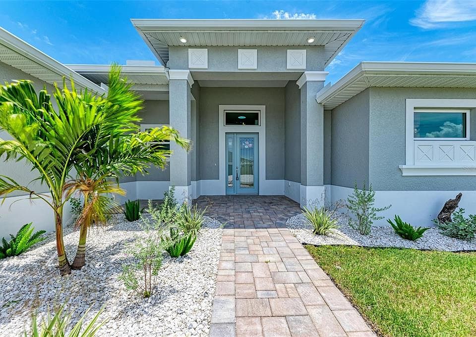 New construction, ready to move in! Ask about our Buydown program, (subject to qualification with our preferred lender). Brand new pool home in the South Gulf Cove area of Port Charlotte with many upgraded features. 1,665 sqft with 3 bedrooms and 2 baths in a split floor plan configuration, garage epoxy floor coating included. The covered entry leads to a beautiful 8 foot impact glass door with sidelight and transom, opening to 11 foot ceilings and a view of the covered lanai and refreshing pool. But as nice as that is, it is the kitchen that will draw your attention. A 36" stainless steel farm sink sits in the large island with granite counter top and white shaker style cabinets that include glass door accents and under cabinet lighting. All stainless steel appliances with a glass and stainless steel range hood and a custom tile backsplash. The pantry provides plenty of storage. Located conveniently nearby is the spacious indoor laundry room with deep stainless steel sink and pull out faucet. The open concept floor plan makes entertaining easy, with plenty of room for guests including a large family area with 12 ft tray ceiling. Soothing gray walls are complemented by unique plank wood-look tile floors throughout the home. No carpet! The multi-panel corner / pocketing sliding door allows you to bring the outdoors in, providing full enjoyment of the Southwest Florida Sunshine. ALL WINDOWS, DOORS, AND SLIDERS ARE IMPACT RATED! The guest bath offers access from the lanai. Entering the master bedroom, you see a tray ceiling, pocketing sliding door to the lanai, and dual closets. The master bath features a huge 8 foot "car wash" style walk-through shower. You'll find more white shaker cabinets in the dual vanities. The master bath also offers a private toilet closet. Exiting onto the lanai, there is generous covered area, an outdoor ceiling fan, plumbing for a future outdoor kitchen, and a large deck surrounding the relaxing pool. Enjoy the sun shelf with lighted bubbler or swim the day away, it's a beautiful life! Schedule your showing today! ***PHOTOS ARE OF THE SAME MODEL IN A DIFFERENT LOCATION, FINISHES ARE SIMILAR***
