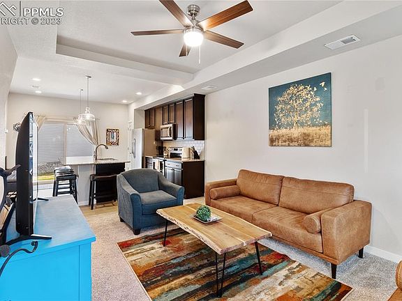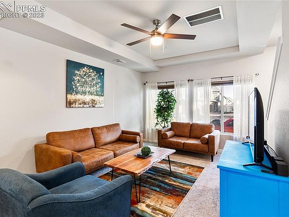 Welcome to this stunning corner lot residence nestled in the sought-after Banning Lewis Ranch master-planned community. As you step onto the expansive front porch, you'll be greeted by a sleek and modern open floor plan drenched in natural light and adorned with the finest upgrades. The heart of this home, the kitchen, is a chef's paradise, boasting an oversized island, deep sink, stainless steel appliances, exquisite granite countertops, a subway tile backsplash, a spacious pantry, and chic pendant lighting. A large slider off the kitchen seamlessly extends the living space into the enchanting backyard, complete with an oversized patio and a wood deck extension. This outdoor oasis is a haven for local songbirds, surrounded by paver path stones and flourishing perennial gardens. Retreat to the luxurious Master Suite, which offers an attached spa-like bath and an expansive walk-in closet. The Master Bath features comfort-height counters, a double vanity, a pebble stone floor with an elegant shower accent, and a comfort-height toilet. The guest bedroom is equally impressive, with a roomy walk-in closet and breathtaking mountain vistas, including the majestic Pikes Peak. The guest bathroom features comfort-height counters, a bathtub, a shower, and stunning accent tiles. Convenience second-floor laundry room offering ample storage and organization space. Residents of Banning Lewis Ranch enjoy access to an array of coveted amenities, including a 24-hour community center, swimming pools, water parks, a resort-style clubhouse, a dog park, tennis courts, and 50 acres of scenic hiking and biking trails. Award-winning schools are a testament to the community's excellence, and the home offers an easy commute to three military bases, conveniently situated adjacent to the Powers corridor. This meticulously designed and meticulously maintained home eliminates the need to wait for a new build—it effortlessly checks all the boxes for your dream living experience.