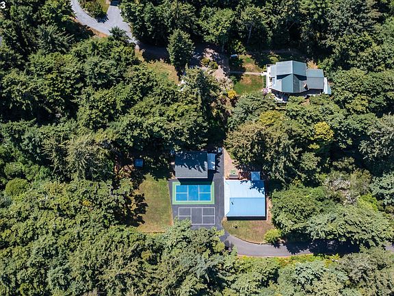Rare opportunity to live by Floras Lake in Langlois Oregon! Enchanting setting to call home with private driveway gated leading to a generously sized paved parking area that hosts 2 full-sized pickleball courts for outdoor fun all year long. With the additional lot fronting the road this 3BD/2BA triple wide manufactured home is tucked away with the trees in a cleared open area, grassy yard, detached oversized 3 car garage with RV sized garage door and tool shed. Covered porch entry to an open great room floorplan with a cozy woodburning fireplace. Sizeable kitchen, appliances included and a split bedroom layout for added privacy for family or guests. Spacious laundry room has a sink and cabinetry for added storage with deck access to hot tub and fenced yard. A new metal roof was recently installed on home in 2015. The garage offers plenty of storage along with an upstairs large bonus area and ¾ bathroom. Floras Lake is about 18 miles south of Bandon in a magical setting and this home is just down the street from Boice Cope County Park with boat access to Floras Lake, beach access and hiking trails. This area is known for kiteboarding, windsurfing and outdoor adventures throughout all seasons. See the link for video too. Shown by appointment only, no drive-by's.