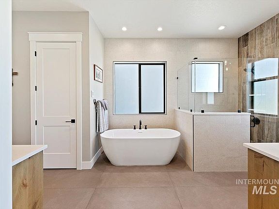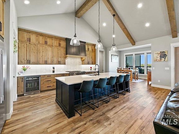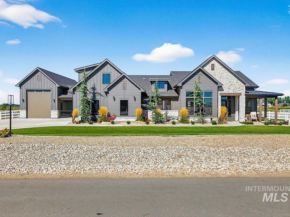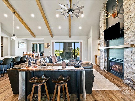 Welcome to this absolute stunner! This custom home built by Mendiola Custom Homes, where no detail has been overlooked. Every bedroom is a private en suite, including the upstairs loft with its own full bath. The chef’s kitchen is a dream, centered around a Bertazzoni dual-fuel range with both gas and electric cooking, plus multiple fridges, a beverage station, and a wine fridge for effortless entertaining. Retreat to the primary suite that feels like a spa with heated bathroom floors, a heated shower seat, double vanities, and anti-fog touchscreen mirrors. Cozy evenings are made better with indoor and outdoor fireplaces, while the patio is wired for TV and sound, perfect for game days or movie nights under the stars. Practical luxury shines with a Briggs & Stratton whole-house generator powered by natural gas, Sonos wiring, EV hookups & 220 power in both the shop and garage. The home is also prepped for a hot tub. Outside, professional landscaping with fencing, curbing, boulders, and vibrant flowers creates a backdrop that blends modern comfort with Idaho charm. This home is where luxury, convenience, and lifestyle meet, all on acreage you’ll be proud to call your own.