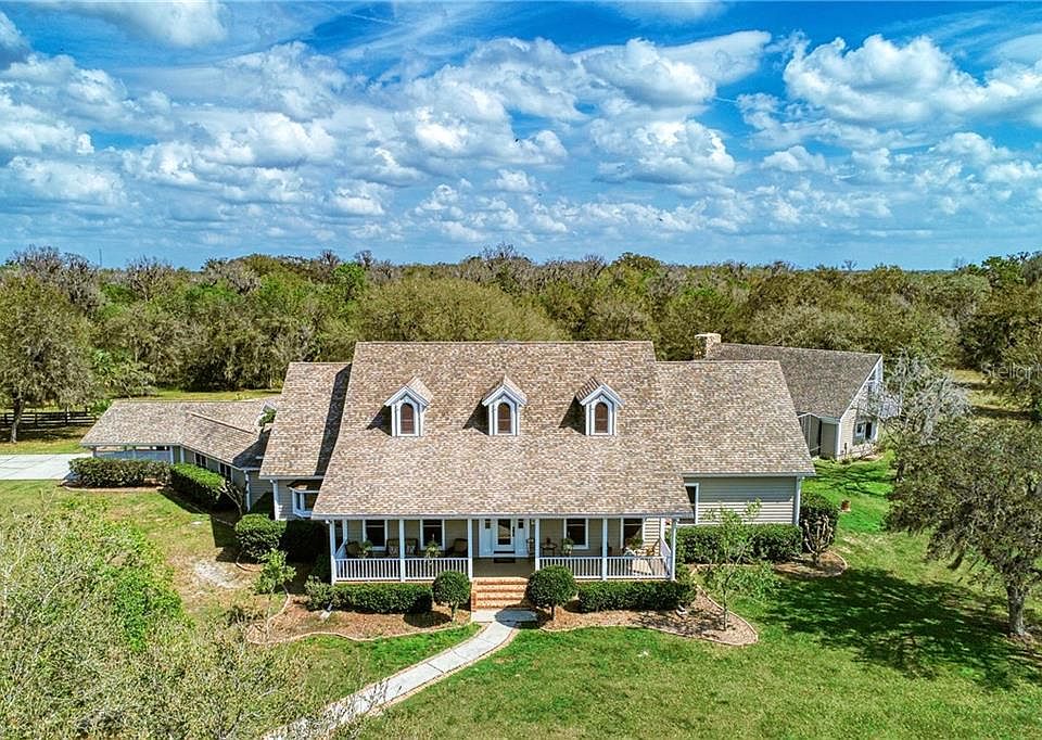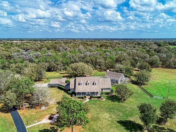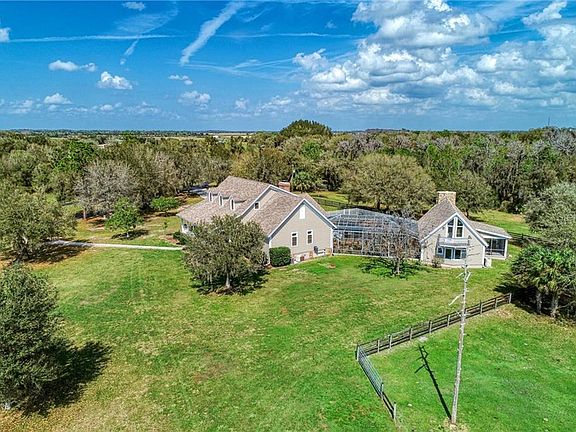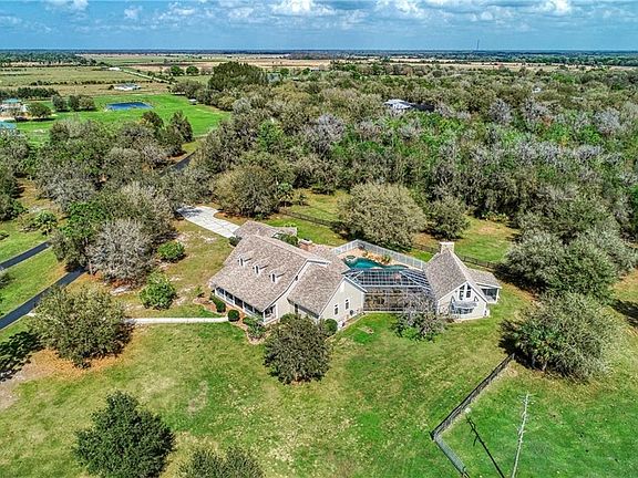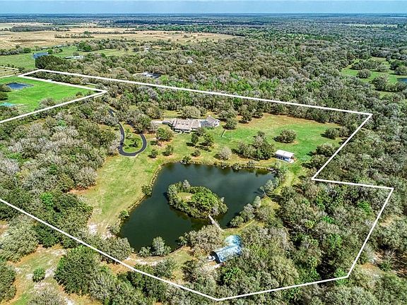 Amazing estate that sprawls out over 24.93 acres. Private & peaceful, this mini farm is being used to raise cattle, tilapia, catfish, and perch. Even exotic access and white tail deer, wild turkeys pass through on occasion. If you are a bird watcher there are a myriad of Florida bird life early morning or at dusk. If you are a horse, llama, or ostrich lover, there is plenty of room for them also. This is a one of kind custom built home with plenty of elbow room. Surrounded by mature landscaping, and beautiful private 2-acre pond, stocked with plenty of fish to catch and eat with an automatic fish feeder. Fish from the bank or the dock which takes you to a center island. These fish know when it is dinner time. A 24 X 36 fish shack is equipped for a camp out and fish fry. Horseshoe pit and plenty of room for your smoker, picnic tables, refrigerators, freezers, campfires and parking for everyone. This shack even has covered parking. Drive around the pond on your way to the house and guest lodge and you will pass by the friendly livestock that will say hello with a loud moo. One of the cows, is extremely proud of her calf. Just before the house is another RV/pole barn which is 30 X 40 and is currently being used to park a boat and trailer and other equipment. The barn also has electric for your RV. Now the custom home! This dream home has been designed with entertaining in mind. Sensational vaulted ceilings and a grand stone double sided fireplace highlight the living/great room. Wood flooring flows throughout the main living area. An inspiring 360 square feet, 20 x 18 kitchen features more than plenty of room to wow your family and guests which includes two separate sinks stations, pull out pantry and an oversized island, beautiful granite counters and custom wood cabinetry. The master suite has the continuance of the wood floors from the main living area and the beautiful staircase. The suite 19 X 23 in size is the perfect place to unwind with views of your outdoor oasis. The master bath is beautifully appointed with his and her vanities and direct heat at your feet when you are toweling off. His and her California custom closets. The guest bedrooms are all spacious, have walk in closets and there own private ensuites. Embrace the enchanting Florida room overlooking the custom oversized pool. The waterfalls are so relaxing. Play your favorite music with the surround sound system to keep the good times flowing. The enclosed lanai is filled with native Florida beauty, just gorgeous while on your walk to the guest lodge, Man Cave or She Cave. It also has a wood burning floor to ceiling fireplace. It truly makes you feel like you are out West only without the snow! A full kitchen, living room, bathroom, and bar. A few steps up the spiral staircase to the bedroom. Open the door and step out on the balcony and oh what a view! Luxurious and one of kind estate home, this property features thoughtfully detail in every area, allowing you to live as you desire. The grandness of this home cannot be understated whether you appreciate the beautiful interior or stay mesmerized by the quiet beauty of the country. There is a creek running along the back of the property that feeds into the pond, providing natural oxygen to the fish. Anticipate living life well in this top-rated community near I-75, restaurants, shops, schools, medical amenities & more. Close to all west coast airports.