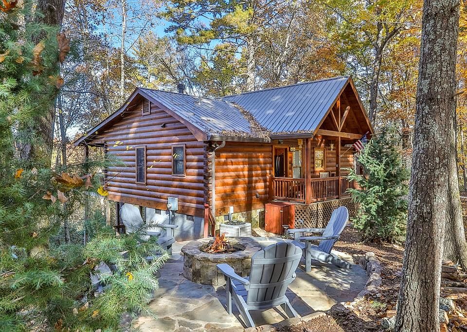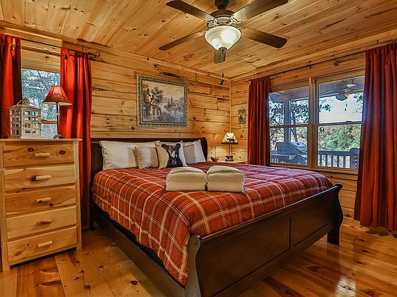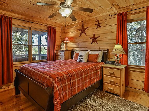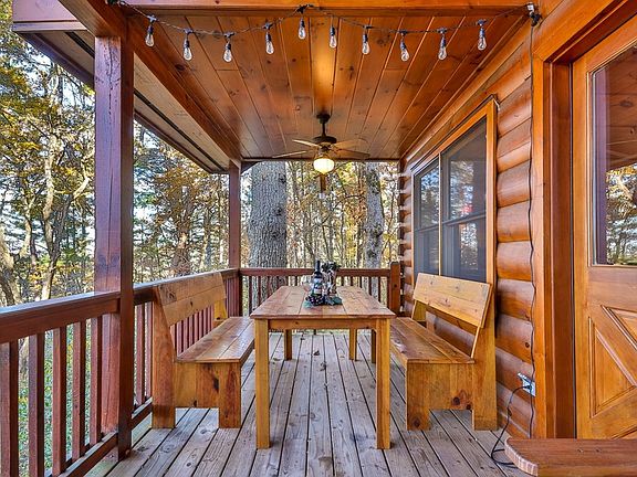 ^Adirondack Style Cozy Mountain Cabin^ This picture perfect postcard setting is the dream mountain escape. Real log cabin featuring 2BR's, 2BA's, both ensuites, w/ open concept living, kitchen & dining in between opening onto large, covered porch across the entire front of home overlooking gorgeous mountain views in the distance. From the time you pull in the driveway you'll be in love. The moment you step inside you'll feel the grandness of the soaring cathedral ceilings through the great rm/dining rm/kitchen area highlighted by exposed beam rafters & fixed glass windows on both gable ends allowing for great natural light. Wood floors throughout w/ custom kitchen cabinetry, granite countertops & stainless appliances. Upgraded lighting throughout including antler chandelier in the dining room area. Located in popular Cherry Log Mountain conveniently located centrally between Blue Ridge & Ellijay in prime ideal location. Enjoy access to several private community lakes great for fishing or canoeing + access to the Benton MacKaye Hiking Trail which runs through the community allowing for easy access. Travel time to either downtown Blue Ridge or Ellijay is less than 15 minutes. Enjoy the “great outdoors” in the evening roasting marshmallows by the outdoor rock firepit. This cabin is an established STR property & would make a prime investment & second home. Allow your investment to be paid for by others! Outbuilding great for extra storage also included in sale. Can be purchased turn key fully furnished! Furniture, decor, accessories to be sold separately via a Personal Property Bill of Sale.