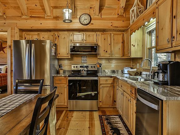 Real log cabinExposed beam raftersOverlooking gorgeous mountain viewsWood floors throughoutUpgraded lighting throughoutStainless appliancesGranite countertops