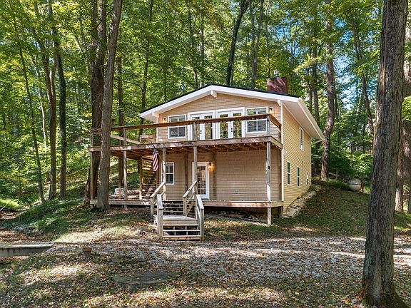 Lake-View Retreat! Completely Renovated in 2020! Over $160,000 in renovations transformed this home down to the studs, giving you the peace of mind of a modern build with timeless style. From the drywall out, everything is new - windows, siding, metal roof, HVAC, ductwork, decks, plumbing, wiring, & more! Step inside to an inviting open-concept floor plan with vaulted ceilings, abundant windows, and panoramic views of the lake & surrounding nature. The kitchen overlooks the dining area & great room, & features a large island with seating, farmhouse sink, subway tile backsplash, butcher block counters, & soft-close cabinets & drawers. The dining area has a cozy gas fireplace with shiplap walls. The Great room looks to pretty lake & nature views. The lower level offers three comfortable bedrooms, a stylish full bath, laundry area with stacked washer/dryer, plus utility & storage rooms. Both bathrooms have been fully updated with modern finishes & tile flooring. Outdoor living is a dream with a wrap-around deck on the upper level—ideal for entertaining or simply relaxing while taking in the scenery. A second large deck at the entry level provides even more space to enjoy. The nearly one-acre lot (.86) is dotted with mature trees & includes two driveways with fresh gravel, a two-car garage, & even a charming walkway across a seasonal creek. Inside, you'll appreciate the white oak floors throughout with carpet in select areas for added comfort. This home is tucked within a vibrant community offering resort-style amenities: a lodge, golf course, clubhouse, tennis and pickleball, amphitheater, 24/7 security, pool, library, five lakes, beach, boating, fishing, ATV trails, gym, & more. The seller is also willing to assist with the community buy-in fee—making this an even greater opportunity! Come experience the perfect blend of modern updates, natural beauty, & community living. this property isn't just a home - it's a lifestyle.
