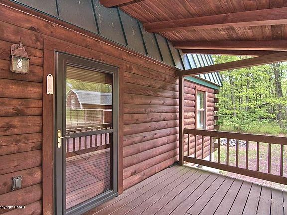 Bear Creek Lakes Community! Hear the Mountain Melody! This Beautiful Log Home is situated on a 1 Acre Corner Lot. As you walk into the Great Room, you will notice the Wonderful Wood Beams, Stone Fireplace and all the Extra Features offered by this expansive True Log Home with 4 Bedrooms and 3 Baths. Lower Level offers Family room, Kitchenette, full bath and Large Bedroom. Special features include Sunroom, 2 Balconies and Covered Porch. Make an appointment today to see this exclusive Log Home.