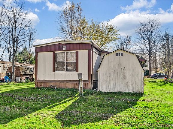 Welcome to 93 Bush Gardens in Alden, NY! Enjoy the quiet, country setting in Marilla Country Village. 2 bedrooms, 1 bath with spacious living room. Featuring abundant cabinetry in the dining area and kitchen for storage needs. Bathroom features double sink vanity and stand up shower. Larger bedroom has built in drawers and two closets. All appliances included; washer is 1 year old and electric dryer 8 years old. Furnace 2022. A/C 2019. H20 tank 2011. Attached carport. Shed included. Lot rent $405 per month, includes: taxes, garbage, refuse, park maintenance, snow removal and water. Subject to park approval. Priced for a quick sale. Use address 93 Oak Dr Alden, NY for GPS directions.