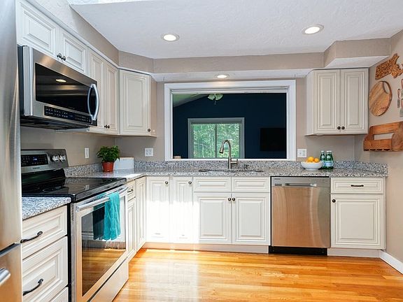 You must see this fantastic, turn key home, ready to drop your bags and move right in! Enter lovely kitchen with granite counters, ss appliances, recessed lights and pantry. Much of the home offers gleaming hdwd floors. Open concept living and dining rooms with cathedral ceilings. Wonderful family room with pellet stove and sliders to a private deck. Primary bedroom offers cozy carpet, direct deck access and gorgeous, fully renovated bath 2021 including tile floor & stone topped vanity. Two other sizable bedrooms with carpet and closets. Main bath with tile floor and newly glazed tile tub/shower. Amazing walk out lower level has a bonus room with a fireplace, pellet stove and a half bath. Custom blinds, convenient 2 car garage with storage, peaceful wooded back yard. Furnace 2011, AC approx. 2002, windows, carpeting, vinyl siding, sliders, electrical, gutters, kitchen and hardwoods all updated in the last 10 years. Near commuter rail, shopping, Ashland State Park. Take a peek!