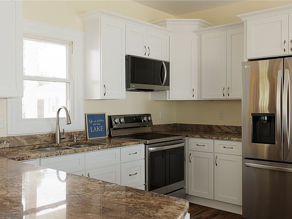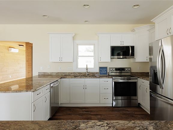 Upon entry, the first floor boasts 9' ceilings throughout the all new dream kitchen with breakfast bar, all new floors, stainless steel appliances, and much more. Your guests and family will love the the unbelievable tongue & groove finished room over the attached garage! Detached garage also has an extra finished bedroom for more fun to enjoy! The deck is forever enjoyable for relaxing with the retractable awning with your phenomenal view! Not a thing to do- you will never want to leave this forever home! Also, golf course so close by!