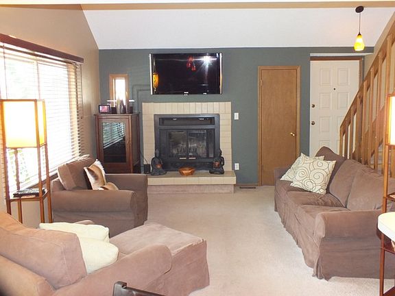 Possibly one of the nicest town homes in the complex! Enjoy the Pikes Peak View from the living room. Vaulted ceilings and ceiling fans in most rooms. Wood burning fireplace in the cozy living room. Pendant lighting and walk-out to the patio in the dining room. Modern, updated kitchen with a breakfast bar. Office has a door and closest - easily used as a bedroom. Lower level can be a huge family room or a third bedroom (has emergency egress). Bathrooms on every level. Central A/C. Private patio. Garage. Walk to downtown!