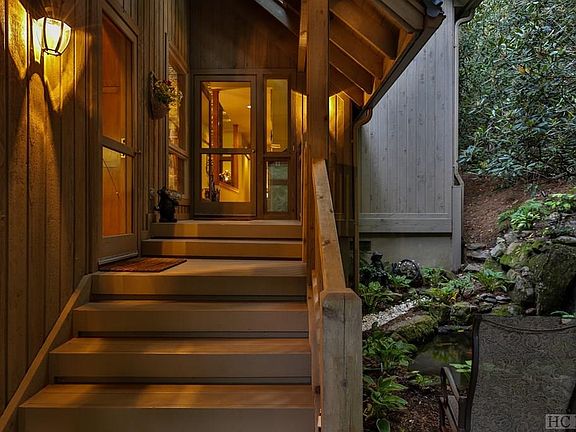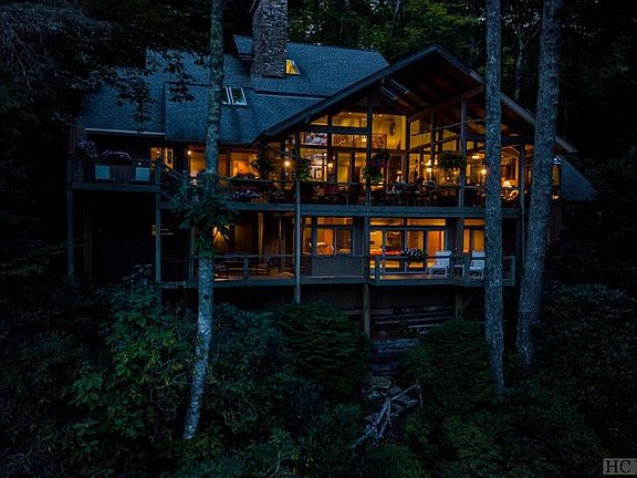 Nestled down a private drive right inside the secure gates of Cullasaja Club is the ultimate mountain home with an amazing view of Lake Ravenel surrounded by waterfall features lulling you into tranquility. Newly listed, this home is of Frank Lloyd Wright style with lots of windows and open spaces as well as cozy nooks for visiting. The remodeled kitchen open to the dining room and great room with a stone fireplace enjoys the lake view. Host some friends for dinner on the massive back deck with built-in ambiance as the waterfalls cascade all around you. Inside, light fills the four-bedroom architect-designed home through massive windows, but the wooded lot preserves a hideaway feeling. The master on the main has his and her closets with a Jacuzzi tub enjoying the outdoor waterfall through the window. Another guest suite is on the main level. A loft office and guest suite are upstairs with a large great room with stone fireplace and a fourth guest suite on the lower level. A pathway leads you to your own personal dock where you can launch your canoe or fishing boat to roam Lake Ravenel which is stocked every season with bass, trout, brim and other types of fish. Cullasaja Club is a very popular country club located half-way between Highlands and Cashiers with an Arnold Palmer golf course, newly remodeled clubhouse with several chic dining venues, a fitness complex with a heated pool, several tennis courts, weight and aerobic rooms, a movement studio where classes are held, three croquet lawns, a driving range and a playground. You may join upon invitation and payment of initiation fee. Living in a sanctuary like 95 Cullasaja Club Drive with all the activities of Cullasaja Club at your doorstep, you will never take another vacation. You will stay home and soak up the views of the stunning lake and waterfalls from your decks and through your windows. Listed for $1,795,000.