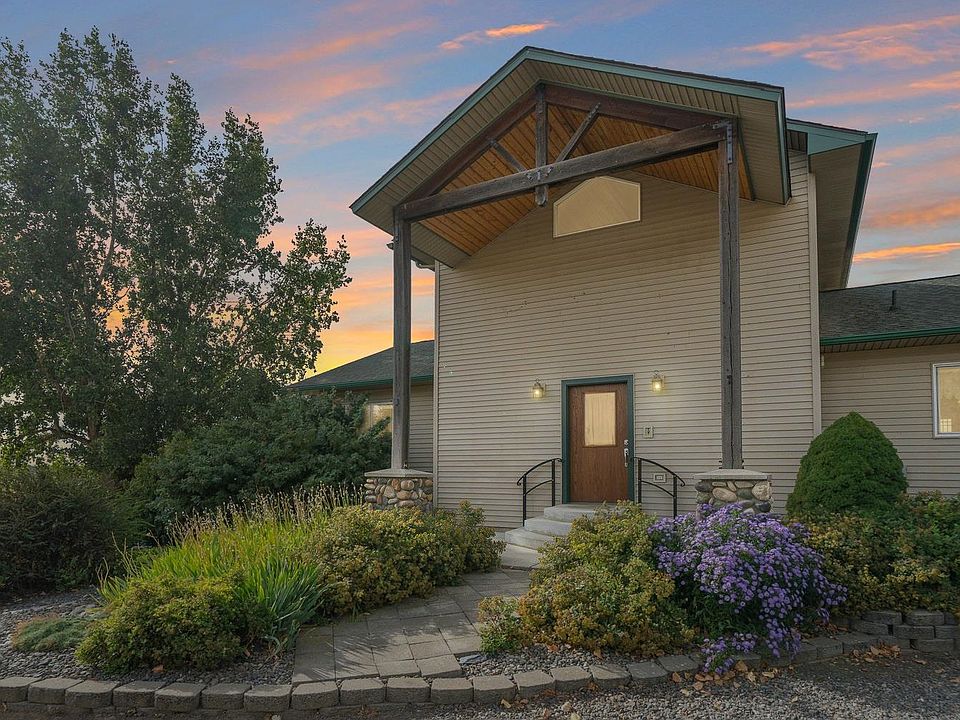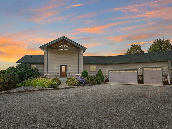 Impressive home with panoramic views on 9.14 acres, with 5 acres fully fenced and a 3-car garage. Inside, soaring ceilings and a striking log staircase create a dramatic centerpiece, while expansive windows frame the scenery and wildlife sightings. Main-floor living offers 2 bedrooms and 2 baths, a great room with custom stone propane fireplace, plus a dining area that flows into a spacious kitchen with granite counters, stainless appliances, and center island. A large, well-appointed laundry area is also on the main floor for added convenience. Upstairs, the primary suite features vaulted ceilings and abundant natural light. The daylight basement includes 1 bedroom, 1 bath, 2 family rooms, and a third bonus space with potential for a kitchenette—ideal for multi-generational living, rental income, or guest quarters. An expansive deck extends the living space outdoors, perfect for taking in the panoramic views. Plenty of room for animals, gardens, or future outbuildings—all just minutes from Spokane.