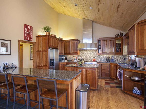Luxury living only 5 minutes from downtown. When searching for a luxury home in Durango, as in most mountain communities, there's often a stark conundrum when it comes to location, views and setting. Rural areas often offer the most dramatic views, and immediate access to the mountain lifestyle many are seeking, while in-town locations offer convenience and access to community amenities, often at the expense of the other considerations. This home is the rare exception. It offers extraordinary views of the stunning red cliffs of the signature and most memorable view corridor in the Durango area, the exquisite Animas River Valley. It's perched high on a hillside overlooking the valley where the area's primary watershed glassily meanders through a pastoral and mountainous setting so beautiful it often is the indelible scenic image seared into the most pleasant memories of Durango's visitors and residents alike. The covered patio overhanging the valley floor feels as if it's miles from anywhere, vistas framed among tall pine trees, and yet this luxury residence is a less than a mile from one of some of Durango's favorite and most sought after in-town amenities, not least of which is the bakery "Bread," which has been featured in numerous publications as a must-visit destination in Durango. Located at the end of a cul-de-sac in Timberline Estates, this home is truly the best of both (all) worlds. It offers in-town convenience and easy accessibility to restaurants, shopping, schools and other area amenities, while simultaneously living perched at the edge of nature's threshold. Acclaimed builder Sandford Gray constructed the home to benefit from its extraordinarily ideal setting, incorporating bountiful outdoor living spaces, a private hot tub area, and plentiful large windows to bring the outside-in as much as possible. The kitchen was completely remodeled by the current owner, who is a professional chef and nutritionist. In doing so she created both the kitchen of her dreams, and one that likely will impress even the most discerning culinary enthusiast. The open floorplan flows from the kitchen through the great room with its high vaulted aspen tongue and groove ceilings and natural stone fireplace. Openness and light are the calling cards of the home's interior, along with its commensurate luxury finishes such as cherry cabinetry, granite surfaces, solid ash flooring, recessed lighting, Beam central vacuum system, radiant in-floor heat with multiple zones, alarm and fire detection system, surround sound and stone accents. It's perfect for entertaining, for bigger families, or those that desire to accommodate out of town visitors, and additionally has a large bonus room ideally suited for a playroom, workout facility or media space. The floorplan is designed with separation and privacy considerations often lacking in other homes, including master and guest suite areas separated from other sleeping areas, and an attached sitting room in the master bedroom (which could also be a great nursery, additional office, yoga studio, etc). A private office is situated away from the primary gathering spaces in the home with built-in cherry cabinetry. A four-car garage will fit all of the toys for your area adventures, or provide shop space if desired, and it has its own half bath. This is the perfect epicenter of the ultimate Durango lifestyle in a quiet, friendly neighborhood with easy access to trails, downtown, and the ski resort. Average LPEA is $188, High - $260, Low - $130