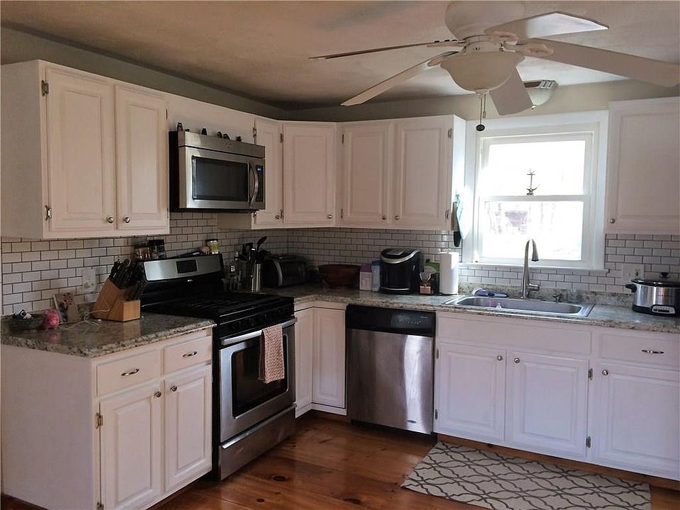 Ideally located 3 bedroom, 1.5 bath Cape in Desirable Porter Estates Section of North Kingstown featuring beautiful Wide Plank Flooring, Open Concept kitchen and Dining room, Bedroom and Full Bath on 1st level, 2 large bedrooms complete with double closets and a half bath on 2nd. Exterior has Replacement Windows, Vinyl Siding and a Large, Fenced in back yard beautifully maintained and just waiting to Burst Forward with Springtime and Summer Flower Gardens adding Beauty and Serenity to a Private and Quiet back yard.