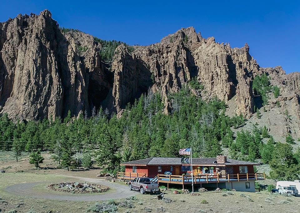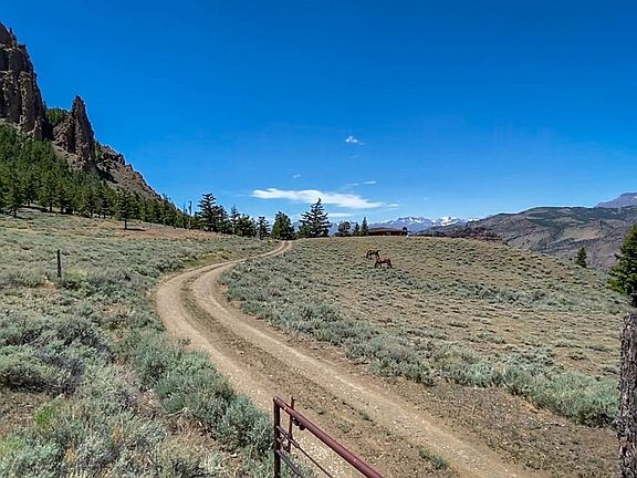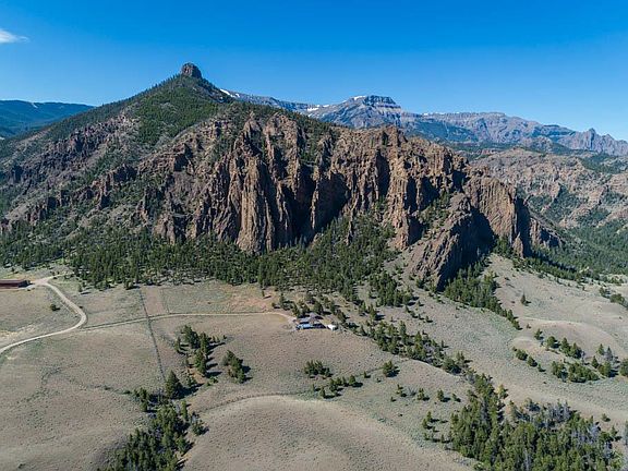 EAGLE'S NEST - This property boasts one of the most impressive views you'll ever find in the Wapiti Valley. Perched high up on the mountain top at the end of the road is this 4,276 sqft home on approx. 20 acres next to the rugged peaks where the bald eagle's soar & the bighorn sheep play. This one-of-a-kind location borders the National forest and has commanding views of the entire valley below.