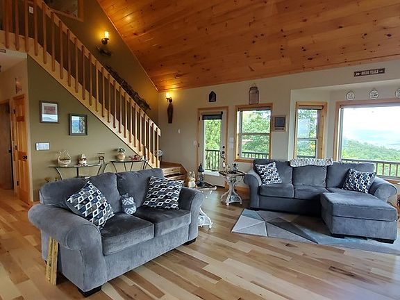 Classic chalet with indescribable Mountain views! Enhanced with 2 custom stone fireplaces, gorgeous hickory floors and premium carpeting. Enjoy preparing meals in the spacious kitchen w/granite counters & SS appliances. With zoned heat & air on each level, everyone will be comfortable. Upstairs is the master bedroom w/large walk in closet, and sitting room. Bath has tile shower, dual vanities, & heated tile floors. Downstairs is perfect for guests, family, or as an AirBnB w/a greatroom, bedroom, bonus room w/laundry, & bathroom. Relax in the hot tub after a long day of playing outdoors. 2-car garage accessed thru the breezeway, and a full wrap porch! FREE internet...and more!!