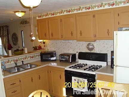 Mobile home has two full bedrooms with carpeting and living room has new carpet and wood flooring, also comes with living room furniture, long sofa converts to king size bed. All appliances included with sale. There were many updates and painting done. Has a good size deck, partially covered for privacy. Also a large wood built shed.