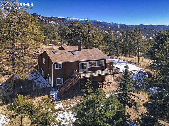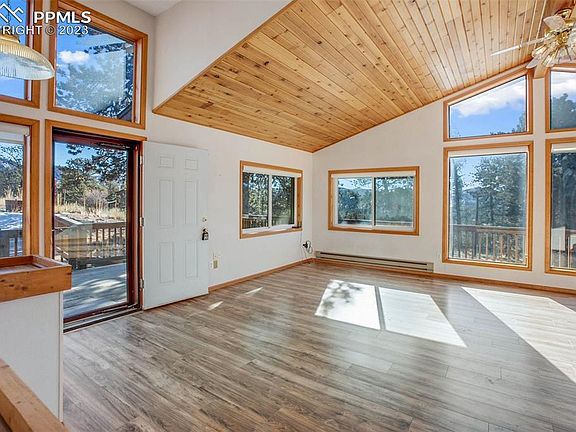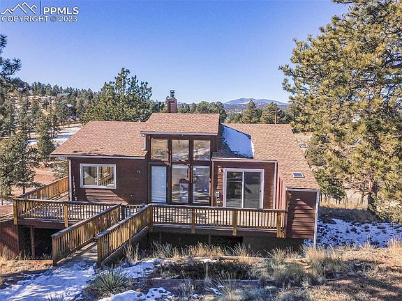 Over two acres with beautiful views! At the end of a quiet cul-de-sac, this home is only minutes from pavement and is private and comfortable. Bright and open, the home's windows provide great light and views from the vaulted great room. There's a nice dining area and extra space off the convenient kitchen with access to the large wrap around deck. New laminate flooring throughout, tongue and groove wood ceilings in great room plus a main level master bedroom. Two large rooms on the lower level are perfect for media or a family room, plus two bedrooms and a full bath. A woodstove and sauna are included. A carport/storage area is detached, and there's a fenced in area for pets. Many closets and extra storage inside and out. Main level living with master bedroom and laundry. This is a great area and conveniently located to downhill skiing, hiking, fishing, national forest, Cripple Creek and the Fossil Beds National Monument. An easy commute to Colorado Springs or shopping in Woodland Park.