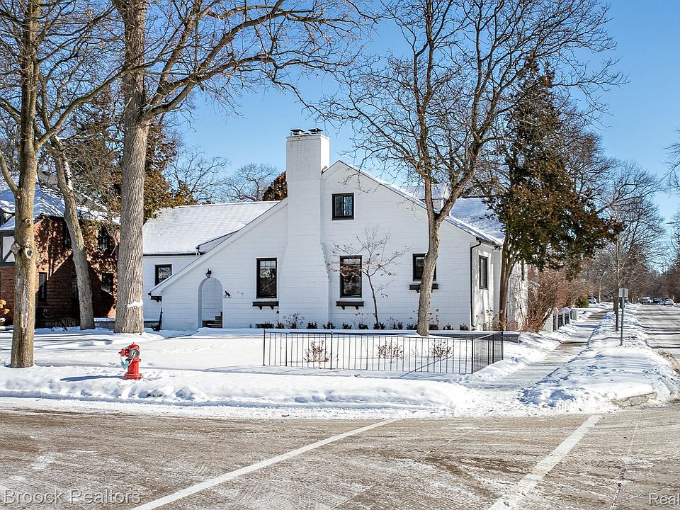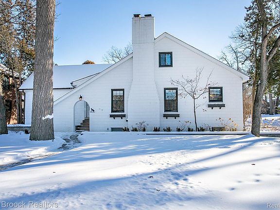 Beautiful Tudor on a large corner lot in the fabulous Pleasant Ridge neighborhood with mature trees, arched doorways, coved ceilings, plaster walls, and so many quintessential Tudor features, but with many modern updates. The lovely private brick patio is so inviting and adds to the beauty of the front entryway of the house. Outstanding open floor plan is impressive as you walk into the front hall and into the formal living room with a gorgeous original stone fireplace surround, huge mullioned windows , and a large custom island that provides dining space with storage and tons of room to entertain. The custom kitchen has stone countertops and chef‘s kitchen appliances, including a 6 burner gas stove with griddle, & a wine fridge. The original leaded glass cupboard doors over the buffet have been preserved. The main floor also has a lovely office that doubles as a 2nd living space or den. The primary main floor bedroom suite is large and has a well appointed bathroom with a walk-in shower & soaking tub. There’s lots of closet space in both the bedroom and the hallway of this private suite. Upstairs, there are 2 charming bedrooms, a remodeled full bath with Terrazzo style tile, lots of additional closet space, and a built-in desk in the hall that creates a charming office or homework corner. The basement is finished and fantastic with a 2nd center Island kitchenette, gorgeous cabinetry and stone countertops, a remodeled 1/2 bath, a large rec room and amazing spa room with a soaking tub and sauna for these cold winter nights. Off the back of the house is a finished 4 season room with a split style heating system, and sliding doors that walk out to the expansive backyard and 3 car garage, where one of the bays is finished with a built-in bar, split heating unit and door wall that leads to a deck, great for entertaining. Vintage charm and modern sophistication combine in this fabulous Tudor on a beautiful block in a great neighborhood with a fabulous community pool!