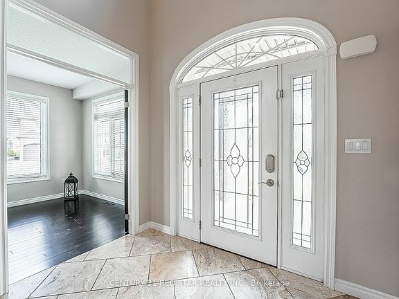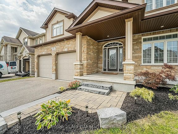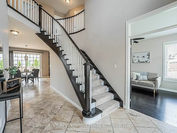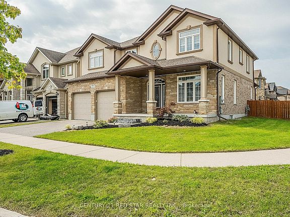 Driving up to this home gives you a sense of prestige, large sun filled corner lot, stone and stucco elevation and stylish front porch. Contemporary home with over 3700 sq ft of finished living space located in High End Riverbank Estates is steps away from the conservation area. You will be amazed by the 2 storey foyer with all the natural light flooding in, curved staircase and the timeless travertine tile that flows throughout the main floor. Other impressive features are rich hardwood floors in the family room and living room. Beautiful kitchen with Island, walk in pantry and stainless steel appliances. Marble/granite counter tops throughout. Huge family room comes with a fireplace with stone mantle and coffered ceiling with potlights. Master suite with 2 large walk-in closets and 5pc ensuite. Finished basement with potlights, 3pc bathroom, den or 5th Bedroom and plenty of storage. Fully fenced huge backyard comes with a large wooden deck for BBQs and entertainment.