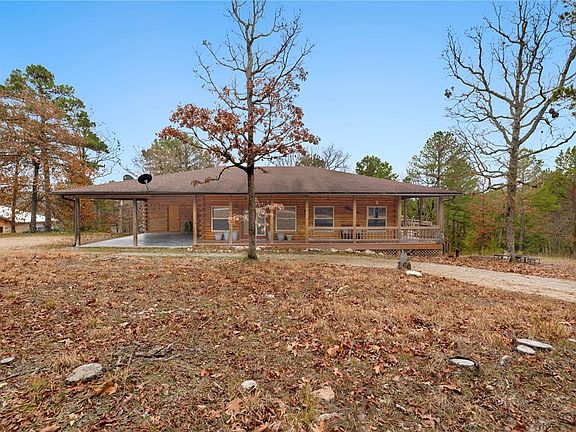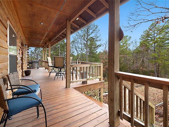 Incredible Morrell custom log home built with locally milled pine just minutes from Main St. Eureka Springs! Close to all the wonderful amenities downtown Eureka Springs has to offer, but out of the city limits and currently being used as an Airbnb with a 5 star rating. This home has many beautiful features including: Birch floors, cedar trim, gorgeous Hickory custom cabinets in the spacious kitchen with an island, lots of windows for natural light, 3 nice sized bedrooms, 2.5 baths, and all on 1.22 acres. The main living space is open and perfect for entertaining. The layout of this home has a great flow and the primary bedroom is very spacious. Relax on the wrap around covered porch and unwind from the hustle and bustle. While outside be sure to check out the extra storage/workshop with electricity under the house and the 50 AMP hookup for a camper by the carport. This home truly feels like a getaway! Come see this home and experience all this gorgeous property has to offer!