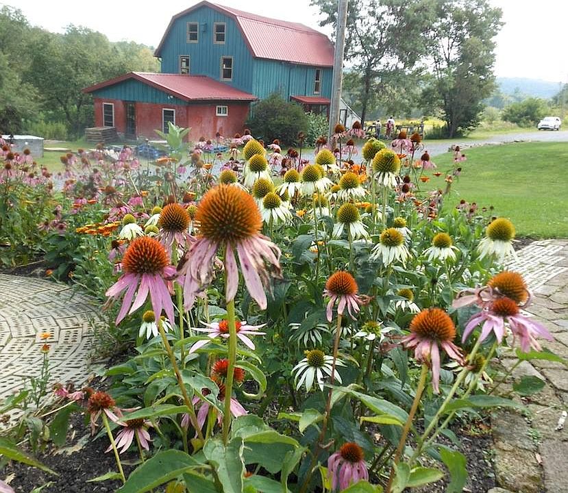 Our farm-school is 30 acres of meadows and forest land. It is highly landscaped with herb/vegetable/flower gardens, fruit orchards, silviculture (150 sugar maples and 300 nursery trees), arbors with grapes/kiwi/wisteria, and buildings. We use only renewable energy to generate electricity (solar and wind with 9 kW capacity). Heating is done with high-efficiency heat pump and outdoor wood burner. We are a near zero waste facility receiving community leaves/bark chips/horse manure for worm composting of food waste. The farm uses Joe Jenkin’s Humanure techniques to handle human waste with 4 loveable loos and a humanure hacienda on site. The water source is a spring running an average 2 gallons per minute which also feeds a ½ acre pond and 6500 gallon holding tanks (5 tanks total from spring water, surface water, and roof water collections). We incorporate art projects throughout the farm-school with 3 stained glass mosaics, a medicine wheel, earthen oven, earthen benches, a living wall with sedums, a stone patio, and many stone walls. We have 9 buildings total: Farm house 1200 sq. feet with 4 bedrooms Straw Bale apartment 225 sq. ft off side of barn Barn 1500 sq. ft with three floors including gift shop, classroom, herb dryer, storage, library Pavilion 900 sq. ft 2 Hi Tunnels- moveable with 3 sets of raised beds 3000 sq. ft Green house 225 sq. ft off side of barn Tool Shed 225 sq. ft Yurt 707 sq. ft diameter with stone and earthen building foundation and bottle brick earthen walls