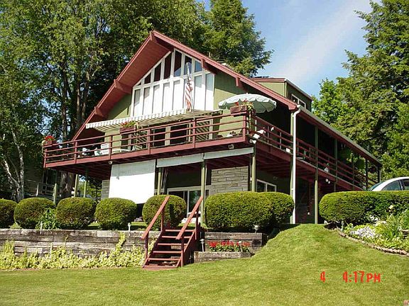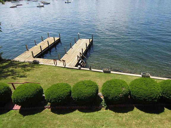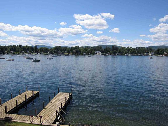 LOCATION!! Well maintained year round home located on beautiful Lake George. Open floor plan- LR w/ two story marble fireplace, kitchen, 4BRs, 3B, lower level FR w/ summer kitchen, laundry, garage w/ storage & workshop plus driveway parking for 8 cars! Tiered lawn leads to the seawall, offering diving from the U-shaped dock into the clear, no-wake zone of Sandy Bay. Or step into the lake from the sandy swim area. Western exposure to enjoy the sunsets from either the open loft area overlooking the living & dining areas, or one of the 2 oversized sliding glass doors that lead to the upper deck or slate patio below. Enjoy the summer sun or roaring fire in the open living areas w/ vaulted ceilings. Plant your flowers & let the 3 zone sprinkler system do the work. Convenient location.