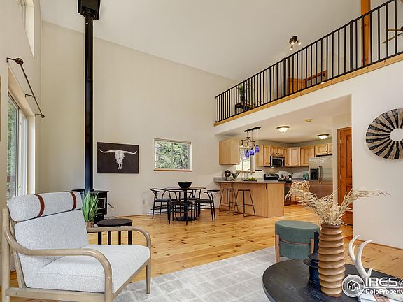 Charming, close-in mountain home near the Middle Saint Vrain and within a short drive to Lyons and Allenspark. Open, bright and lofty feeling interior with vaulted ceilings, light wood floors, wood stove and spacious kitchen with lots of counter and prep space. Loft primary bedroom with private bath and walk-in closet. Enjoy listening to the river from the covered deck off the great room or the terraced rock garden in the private backyard. The land feels private yet offers close access to Highway 7. This location is ideal for recreational pursuits. You're within minutes from forest access and a short drive to Rocky Mountain National Park, Indian Peaks Wilderness and the Peak-to-Peak Highway to taken in the fall aspen leaves.