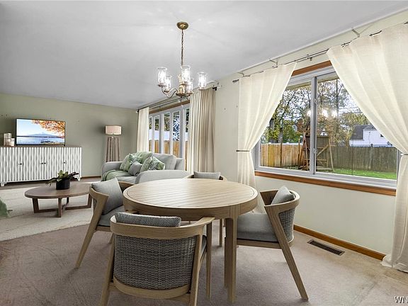 Discover serenity in this move in ready 3 bed, 2 bath ranch style home located in a peaceful, quiet neighborhood. Step inside to a well-lit, open-concept living space connecting the living room and dining area and then on to a well equipped kitchen featuring a stove, oven, refrigerator, dishwasher and convenient eat-in area. The primary suite offers a private bath, w/2 additional bedrooms & a full bath for your guests. The spacious finished basement provides a versatile space for watching Bills games or for a quiet home office. Built in shelves give you lots of room for storage and the included washer & dryer make laundry a breeze. Enjoy outdoor living on the covered back patio, overlooking a fully fenced backyard for privacy and relaxation. Updates include: Complete Tear off Roof - complete ice shield & self sealing nail wrap, Certainteed siding w/insulation & tyvek, chimney, exterior drain tile, basement waterproofing, concrete driveway & sidewalk, updated electrical service w/outlet wired for a generator. Showings start 11/3/23 at 11am. 24 hr notice for all appt requests. Some pictures are *virtually* staged to help you envision what rooms could look like with your furnishings.