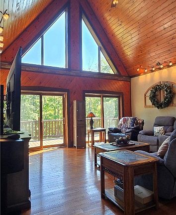 Inside, the main floor features a spacious master bedroom suite with private access to the wraparound deck—perfect for morning coffee or evening relaxation. The living room boasts soaring cathedral ceilings that flood the space with natural light, creating a dramatic yet cozy atmosphere. Adjacent to the living room, the dining area opens directly onto the expansive back deck, which wraps around to the master suite. This outdoor space is ideal for hosting gatherings, enjoying nature, or simply unwinding in privacy. A convenient half bath completes the main level.