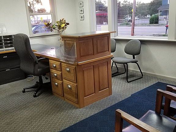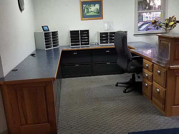 This property has a large reception area and 3 private offices. Custom hickory reception desk by Maedl Woodcraft with built-in lateral files provide plenty of work area and storage. Building has unfinished basement.