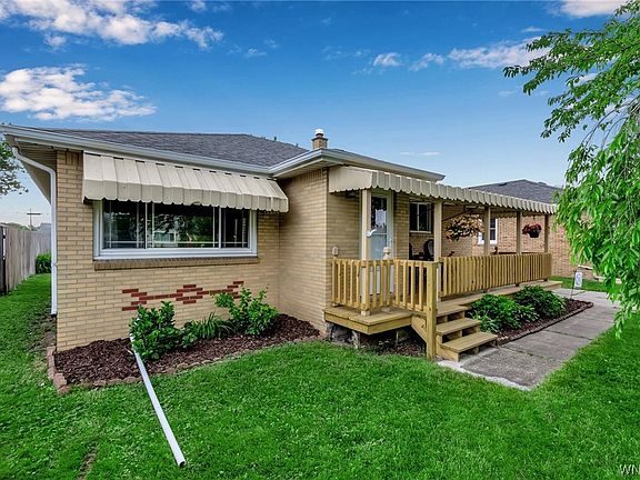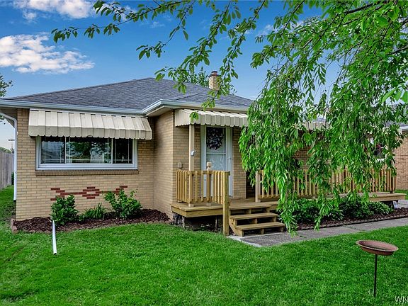 Highly desirable all-brick ranch in Cheektowaga, with 3 bedrooms, 2 baths, and a finished basement! The backyard is spacious and well manicured for carefree landscaping. The eat-in kitchen is large, with a cut-out into the living room, creating a welcoming, open concept feel. The primary bedroom has two closets for storage. Downstairs, the basement is split into two parts- the utility area and the finished area. The finished basement adds so much extra square footage, with a huge TV (included with sale), bar and shelving, and a full bath! This home has been metitculously maintained and updated. Updated electric, kitchen floor, bathroom, carpeting. HWT (2017), Windows (2015), Front Door (2015), concrete pad (2020), front porch (2022), furnace & A/C (2019), and more!