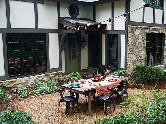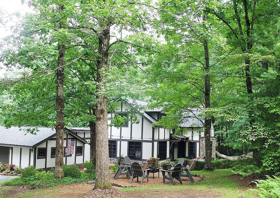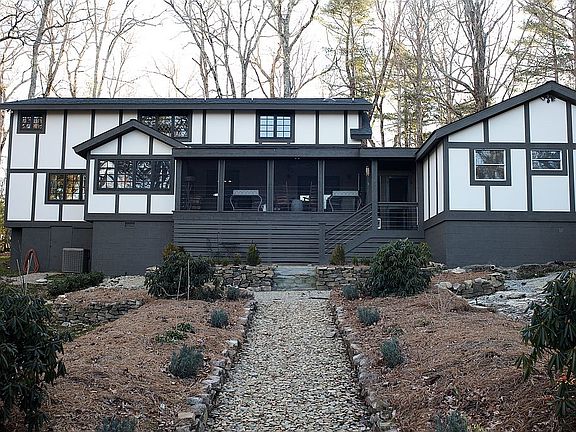 Completely renovated inside and out Tudor home in secluded neighborhood one mile from the Cashiers crossroads. Community water and paved roads. Beautifully landscaped outdoor living spaces for sitting around the fire pit and alfresco dining. Large classically inspired garden area in the sunny back yard bordered with stacked stone walls. Flat, wide driveway with ample parking for guests. 2 car garage with large storage and laundry rooms. Covered screened porch and grilling area. Bedroom and bath on main level (expandable to a Master suite on main). Large Master suite with luxurious bath and large walk-in closet on the second level along with a 3rd bedroom, ensuite bath and walk-in closet. The rustic Great Room features a beautiful wood burning stone fireplace with a high vaulted truss ceiling and library balcony. The gourmet Kitchen delights with a 9x3 foot island with cabinets on both sides, granite tops, stainless appliances and brick wall accents. There are 2 dining rooms and a keeping room with woodland views. A home office rounds out the main level. The spacious 462 sf screened back porch is a comfortable and dry spot for dining and lounging with 2 ceiling fans and a wall-mounted heater for cooler weather. Seasonal mountain views. 3100 gsf.