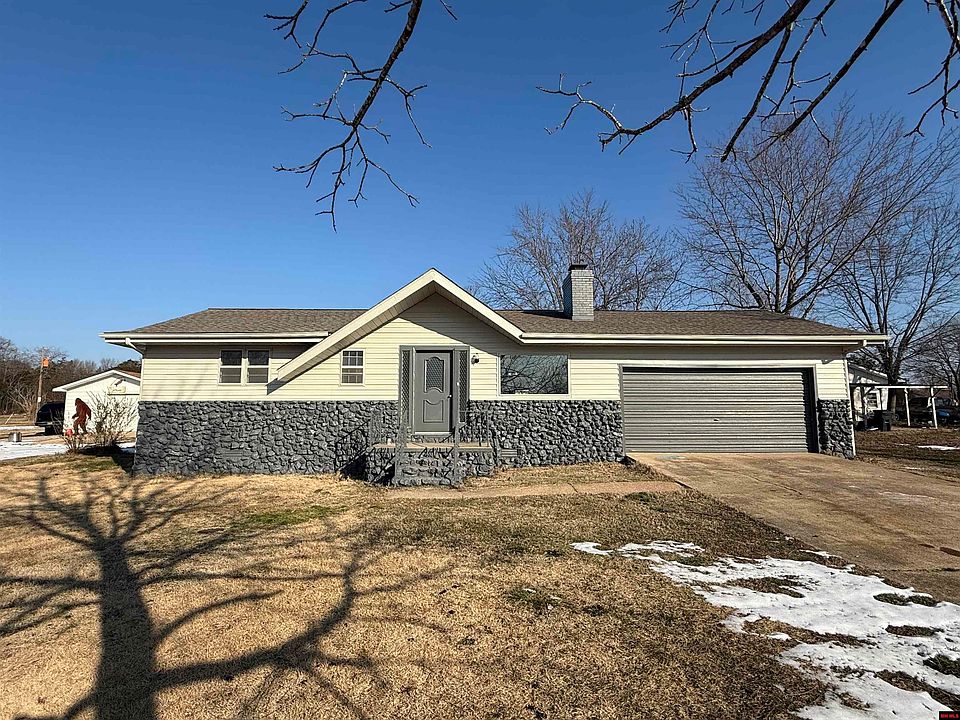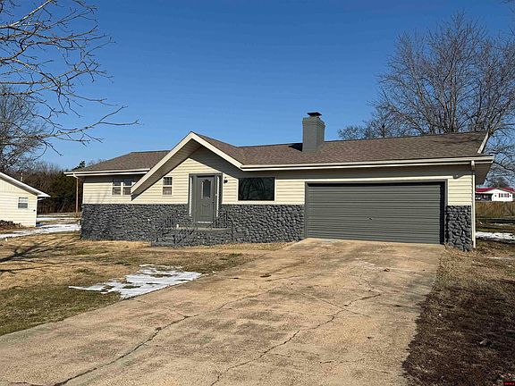 This charming 3-bedroom, 1.5-bathroom home features a 2-car garage and is conveniently situated in the heart of town, just outside the city limits. It sits on a spacious and level lot that is over 0.5 acre m/l with no restrictions. The property boasts new flooring, fresh paint, modern appliances, a newer roof, and updated bathrooms, and new kitchen appliances. You'll appreciate the abundance of natural light, a cozy wood-burning fireplace, and a covered deck.