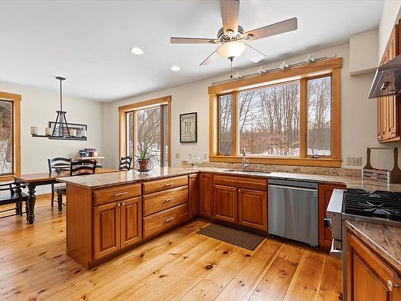 Light, bright and TONS of living and storage space! Come see what this Arlington home has to offer. Welcome covered porch entry make this entry inviting yet casual. Large open living spaces greet you with newly finished wood flooring throughout the first floor. Cooks kitchen with Viking stove, plenty of counter space for prep and serving. Large windows invite the outdoors in with lots of light, filling this kitchen and dining space. Living room with access to outdoor deck and mountain views. Back inside sit by the gas fireplace while enjoying the company of friends and family or the mountain view through the large windows. Main floor bedroom ensuite is perfect for guests or simple one floor living. This home explodes with three additional living levels - the lower level gym with kitchenette, den/tv space and additional spacious room - serving as an office/boardroom currently but the possibilities are endless. The second floor provides master ensuite, third bedroom with bathroom and a family room offering gas fireplace and beautiful mountain views. The fourth level houses a rec room with half bath and fourth bedroom. Each living level provides plenty of privacy yet space for one and all! IN-joy the comforts of home while taking in the VT peacefuless and landscape this location has to offer.