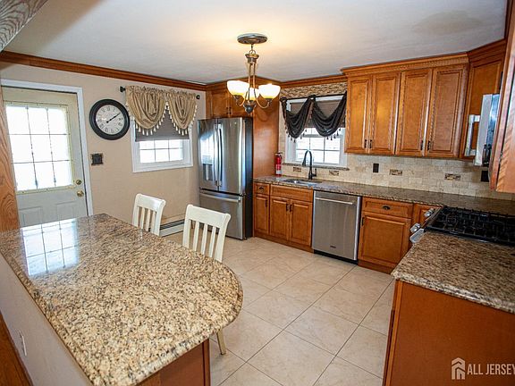 A must see this Lovely 4 bedroom 2 full bath Cape in the Morgan section of Sayreville*Home Features Updated Eat in Kitchen with Granite Countertops and Breakfast bar with all Stainless steel appliances*Ceramic Backsplash and tile*Hardwood Floors in Living room with Bay window and 2 bedrooms*1st floor bedroom can be used as a Formal Dining room which exits to Nice fenced in yard with Deck leading to above ground pool and 2 car detached garage*A great staycation home for summer fun**2nd level boasts 2 bedrooms*Walk in closet and new Laminate wood floor*Attic Storage*Full finished basement makes for a great entertaining area with a newer Full bath*recreation room/laundry room*Easy commute to NYC Close to train*This is a must see!!! Electric fireplace in basement is in as is condition, as well as the dishwasher.