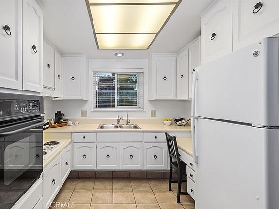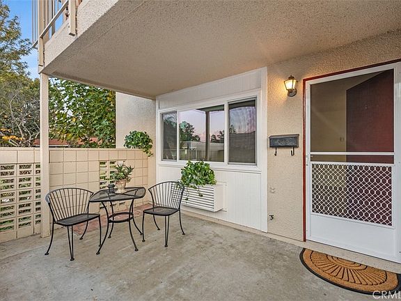 With a preferred ground floor location, this bright corner end unit welcomes you into serenity. Large picture windows bring views of greenery inside yet a sense of privacy prevails. From the enclosed patio at the entry, it is a quick walk to a nearby creek and your assigned carport with storage cabinets. This Cadiz model is a well-planned design offering large rooms with an open flow for comfort and entertaining. The kitchen has numerous cabinets plus a small desk space area, appliances are HOA maintained and the HOA will be replacing the countertops in the near future. HOA dues include water, sewer, trash, and cable. There is an inside laundry area off the bathroom. Newer upgrades include all retrofit windows, warm wood-like laminate flooring, tiled floors in the kitchen and bath, mirrored closet doors, glass doors enclosed tub area and recent paint throughout. The 55+ Laguna Woods Village community offers residents private security and 24 hour guard gated entry, a 27 hole championship golf course, 5 swimming pools, spas, a horse stable, tennis courts, 7 clubhouses with many activities, art studios, wood shop, pickleball, lawn-bowling courts, gyms, over 200 clubs and much more. Don't miss this chance to enjoy a comfortable lifestyle at an affordable price.