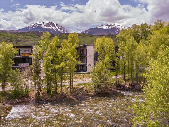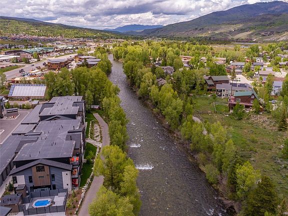 Take in the sweeping views and serene sounds of the Blue River in this coveted and rare ground level riverfront unit. This Mountain Modern Masterpiece, located in Silverthorne’s luxurious River West neighborhood, provides easy access to world class ski resorts and Gold Medal trout fishing literally steps outside your back door. You’ll catch your breath as you enter to the floor to ceiling windows, Olympia quartz counters with waterfall features, radiant heated floors, stainless steel appliances, and luxury vinyl plank throughout. The kitchen is the place to gather with plenty of seating, counterspace, oversized island and pendant lighting. The chef’s kitchen is complete w/ high end appliances featuring a four burner gas range with griddle, undercabinet lighting and large pantry. The great room boasts unobstructed views of the Blue River from every angle and cozy gas fireplace with warming hearth. The spacious primary suite features a walk in closet, roomy bath offering floating European flat panel cabinetry, dual sinks, and large walk in shower tiled floor to ceiling. Sleep comfortably in the secondary bedroom on the queen over queen custom made bunk beds and large closet. Step outside to your heated large private covered patio, sounds of the river and fresh mountain air. Perfect place to enjoy your morning coffee, BBQ with friends and family, or relax in the evening after a day of mountain adventures. Don’t miss the community hot tub, fire pit gathering area, and walking-bike path along the Blue River. Walking distance to restaurants, shopping, theater. Affordable HOA dues includes heat and gas fireplace. One reserved carport space in front of unit and large attached private storage/ski locker with 2 parking passes for additional parking. This mountain getaway comes fully furnished. Don’t miss the luxury, convenience, and natural beauty that come together seamlessly in this magnificent home.