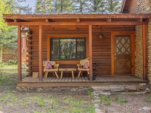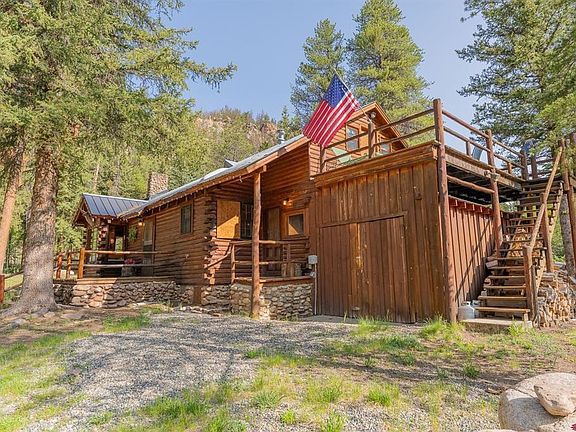 If you’ve been dreaming of a cozy cabin in the woods with live water, this might be the perfect fit! Nestled among towering pines on an expansive 1.6 acres with 156 feet of Spring Creek frontage, this historic log cabin has been thoughtfully updated with modern comforts while preserving its unmistakable Colorado charm. Inside this rustic retreat, you’ll find warm pine paneling, exposed log beams, vaulted ceilings, rich antique wood flooring, and a unique layout enhanced by radiant in-floor heat. Enter through the welcoming Dutch front door into a spacious great room anchored by a classic cobblestone wood-burning fireplace—an ideal gathering spot for family and friends. The updated kitchen shares this open space and features custom cabinetry, granite countertops, stainless steel appliances, a massive granite slab island that seats seven+, and a skylight that fills the space with natural light. The cabin’s well-planned layout includes three spacious bedrooms, each with its own updated en-suite bathroom. The primary suite offers a spa-like experience, complete with a personal steam shower, walk-in closet, and private deck. Just off the kitchen is a practical cold entry with exterior access, a mechanical room, hot water heater, and a dedicated laundry area. Outside, you'll discover a variety of inviting outdoor spaces. Relax on one of three expansive decks—including one atop the garage that offers panoramic views, an enclosed bonus room, and its own half bath. There’s also a separate grilling area, ample seating on the deck above, and mature pines that provide seclusion and shade. To the west of the property lies a charming irrigation ditch, shallow enough for kids to splash in, complete with a log bridge and shaded sitting area. On the eastern side, a wide-open meadow overlooks the creek and offers plenty of room to build a detached garage or to park an RV or UTVs for visiting guests.This rare property also includes approximately 650 feet of shared fishing on Spring Creek—an incredible bonus for outdoor lovers. A truly unique find! Please respect paying guests staying on property.