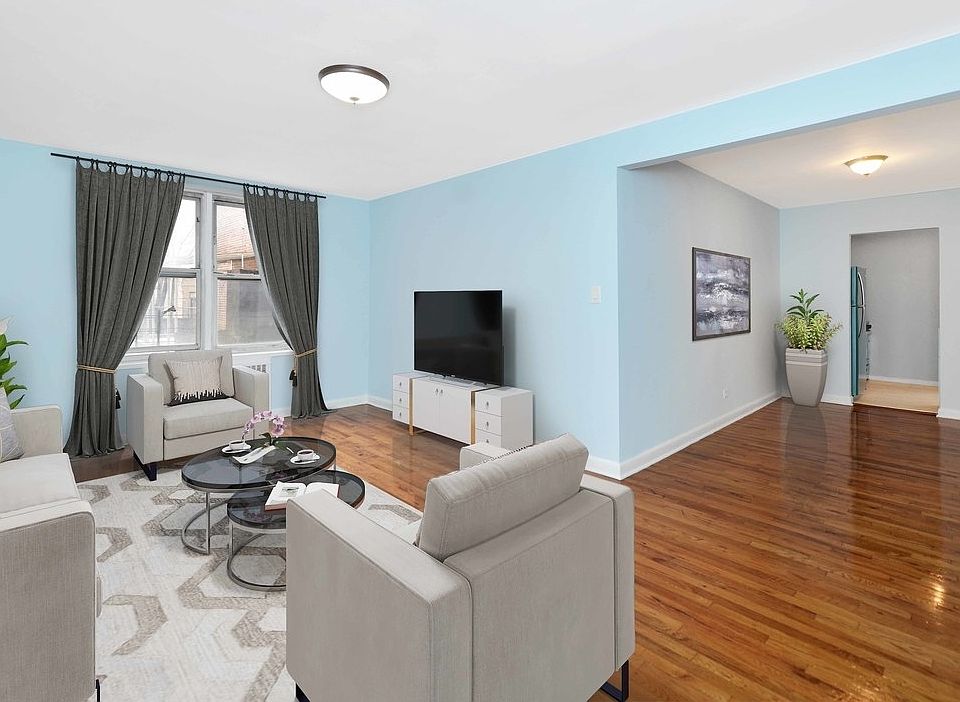 This is an exclusive listing of AmeriHomes Realty 718.447.2626. Located on a quiet, cul-de-sac street, this sprawling second-floor home spans a full 750 square feet, with hardwood floors running throughout, complemented by lots of natural light streaming in via multiple exposures. A large foyer opens into the open-plan living and dining area, which provides generous room for living and entertaining. The eat-in, windowed kitchen has space to either expand the cabinets and counters or add a breakfast table and chairs. The bathroom is also windowed. The extra-large bedroom can easily fit a king-sized bed. The home offers Southern and Western exposures providing excellent natural light with ample space for both living and sleeping. It also features 8ft ceilings and ample closet space. Competitively priced, affording you a unique opportunity to create your own signature home in a beautiful co-op in the heart of a most charming and convenient neighborhood. This elevator building features a responsive live-in super, porter, laundry room, bike room, and in-door parking offered based on availability. Extra storage space is available. Sorry, no pets are allowed. Maintenance includes electricity, heat, hot water, gas, and property taxes. Secure building with excellent financials plus NO flip tax! Sublet permitted after two years. This building is equipped with Verizon Fios. Nearby train lines include the B, Q & F. PLEASE NOTE: Apartment is empty, furnished pictures were Virtually Staged with raw pictures adjacent. All renderings are for illustration purposes only. Please contact AmeriHomes Realty to schedule a private showing.