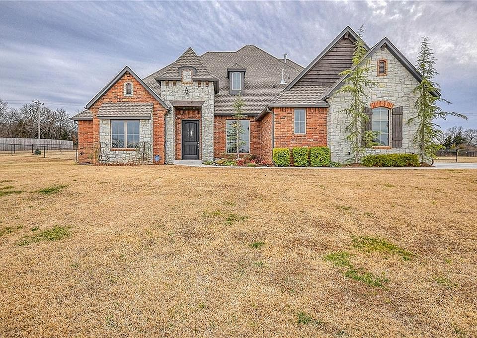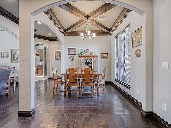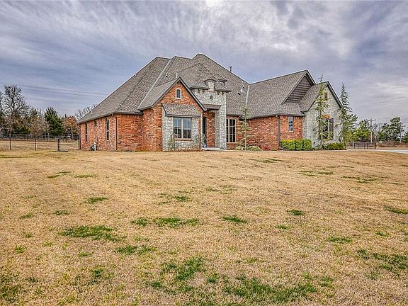 Pristine home sitting on 1.17 acres in cul-de-sac! Quality extras; Hardwood flooring, 10' solid core doors, extensive crown molding & woodwork. Chef's dream kitchen! Pro 5 burner Bertazzoni gas range, convection oven, granite counters, island, built-in desk, walk-in pantry, & additional pantry to store larger cooking & baking appliances! Formal dining w/wood cross beam ceiling & matching floor. Study w/built-in bookcase. Master suite has barn door, double vanities, walk-in shower, whirlpool tub, & walk-in closet w/utility room access. Secondary bedrooms have large walk-in closets, & Jack & Jill bath has a private vanity for each room. Outdoor living area features a covered patio, fireplace, ceiling fan, & wood inlay ceiling. Possible bonus space above garage. Home wired inside & out for surround sound, has an 8000-watt Generac electrical panel for generator backup, & 6-8 person in-ground storm shelter. Gated entrance, 2 large ponds, & easy access to shopping, downtown, & Tinker AFB.