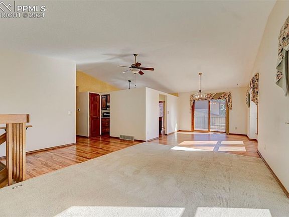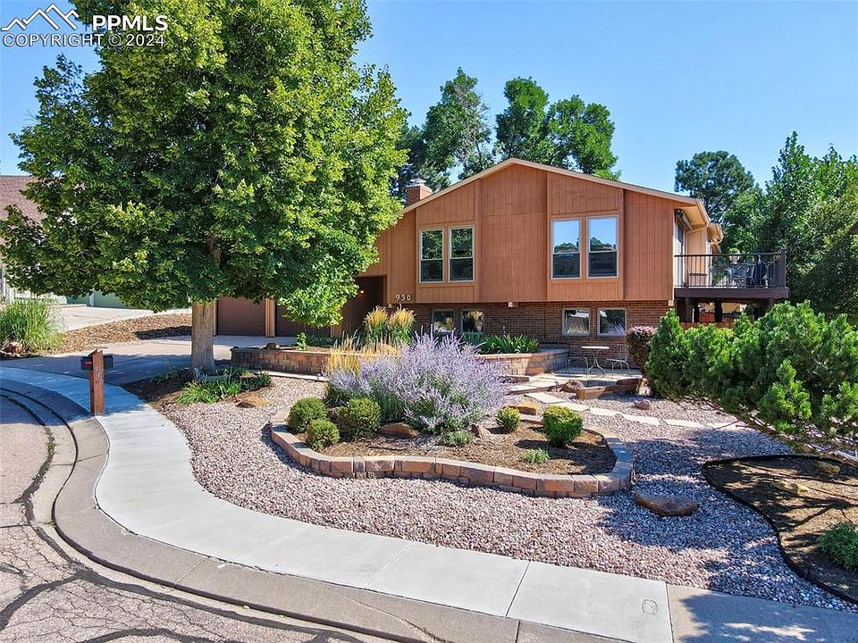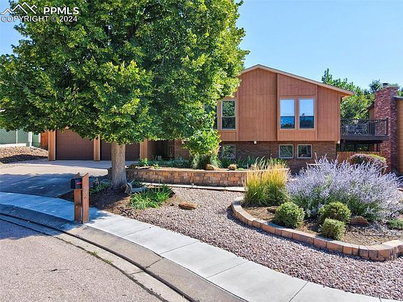 Welcome to Your Dream Home! Nestled in a tranquil cul-de-sac, this stunning 4-bed, 3-bath residence is perfectly situated in the heart of Rockrimmon, just moments from scenic hiking trails, including the breathtaking Ute Valley Park. This home is only a short walk to Academy District 20's Foothills Elementary School/Park and Eagleview Middle School. As you arrive, you're greeted by a beautifully landscaped front yard with mature trees and captivating mountain views. The backyard is a true outdoor oasis, featuring a gorgeous stamped concrete patio shaded by an electric retractable awning—ideal for entertaining. Step inside to a beautifully tiled entryway with garage access. The upper level boasts a spacious great room with vaulted ceilings and lots of natural light. This flows seamlessly into the dining area and the chef’s kitchen, featuring gleaming hardwood floors, quartz countertops, stainless steel appliances, a gas range, and a sunny dining nook. From the kitchen or dining room, step out onto the composite deck to savor your morning coffee, with another retractable awning to keep you cool on warm days. The primary suite features large windows overlooking the backyard, walk-in closet, bathroom with two vanities and a standalone shower. An additional bedroom on this level can serve as an office/flex space, alongside a remodeled full bathroom with ceramic tile flooring, a skylight, and jetted tub. Step down to the lower level to the cozy family room, anchored by a charming brick gas fireplace. Here, you’ll find two spacious bedrooms, a large bathroom with shower, a spacious laundry room with storage, and a large storage room. The lower-level bedrooms also feature new paint and carpet. Updates include a brand new Atlas StormMaster asphalt shingle class-4 roof, new Andersen fire-rated, energy efficient front door and foyer door leading to the garage and many Renewal by Andersen windows. This home has so much to offer. Don’t miss the opportunity to make it yours!
