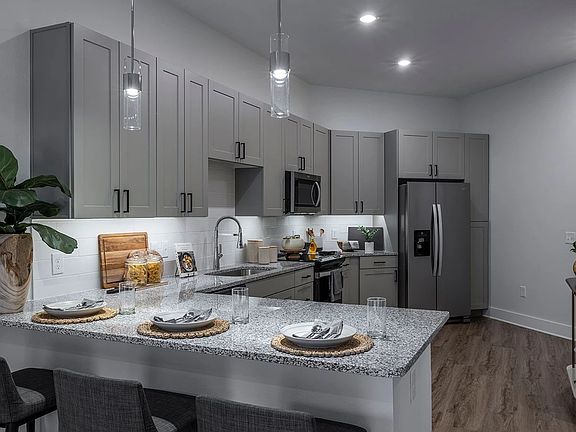 • Exterior features: Availability 24 Hours, Barbecue, Bicycle storage, Building-wide Wireless, Business Center, Concierge, Conference Room, Cornhole, Decorative transom window *, Designer interiors, Electric car charging stations, Ethernet connections, Expansive 9' and 10' ceilings, Fiber optic internet (1GB)*, Fire Pit, Game Room, Gazebo, High-speed Internet Ready, Hospitality bar with coffee and tea, Lawn, Luxe shower with rain shower head *, On-Site Management, Online Maintenance Portal, Online Rent Payment, Package Receiving, Party Room, Pet Park, Pet Washing Station, Ping Pong, Quartz countertops, Relaxing spa-soaking tub, Smart home technology, Stainless Steel Appliances, TV Lounge, Theater, Under cabinet lighting